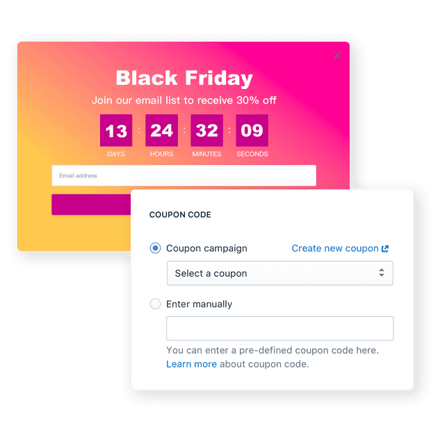 How to add coupon codes to signup forms - Klaviyo - Help Center Choose Shopify Coupon as your Unique Coupon Type. Click the dropdown next to Unique Coupon to either choose an existing coupon, or click the plus sign (+) to create a new Shopify coupon. If you chose to create a new, unique Shopify coupon code, a modal will populate asking you to: Name your coupon (e.g. 10OFF), and add an optional Prefix.